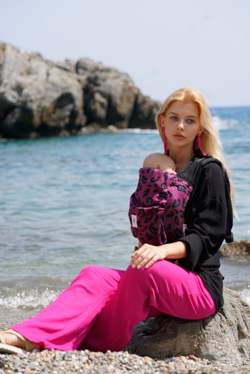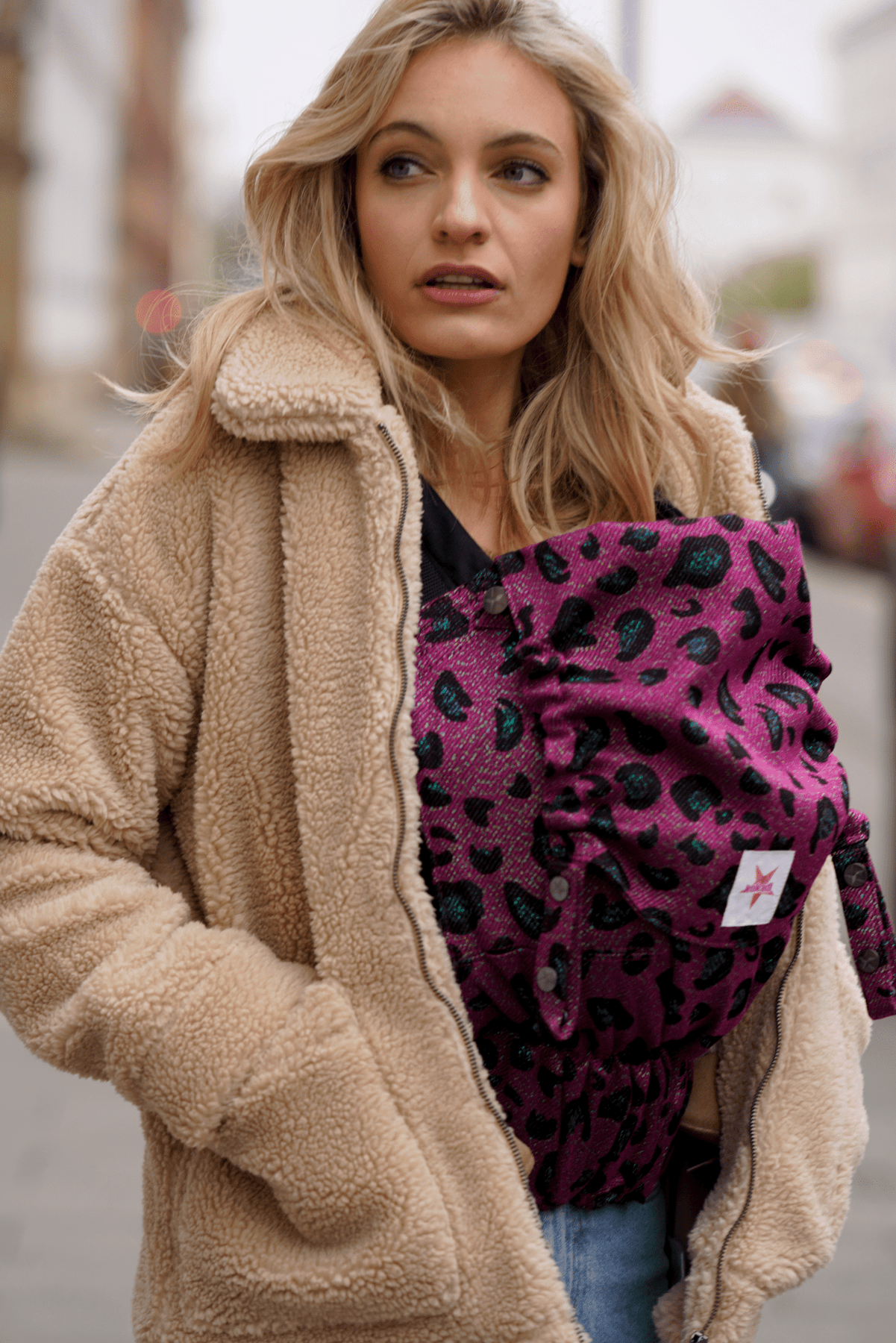 Silky, flowing fabric and a trendy leopard print in bright pink that is interspersed with sparkling green glitter threads. This one Baby Carrier will make your heart beat faster - that's Safari Caspar!