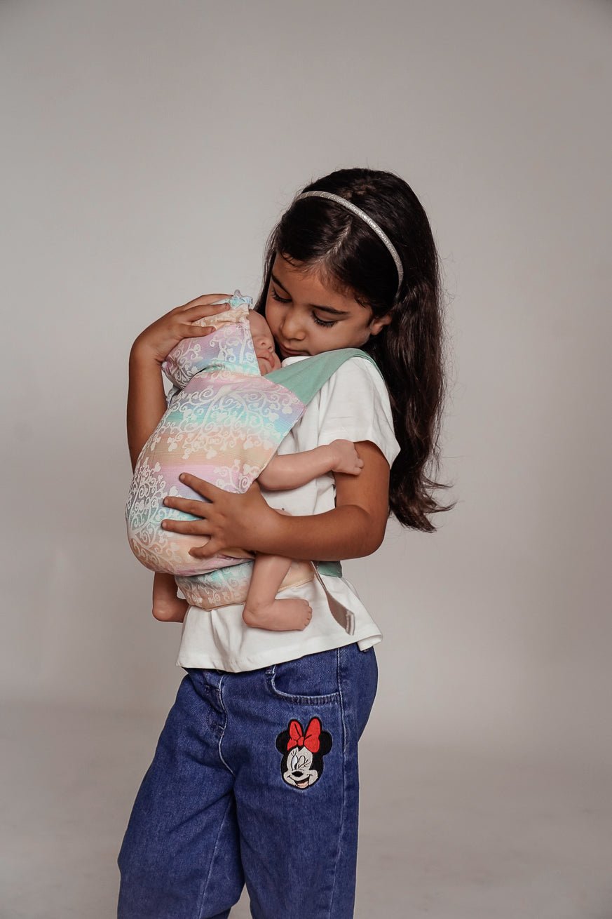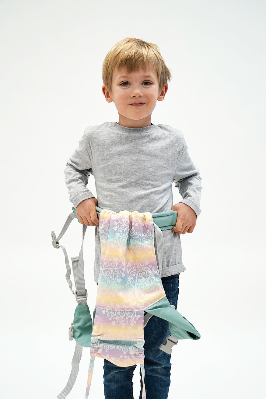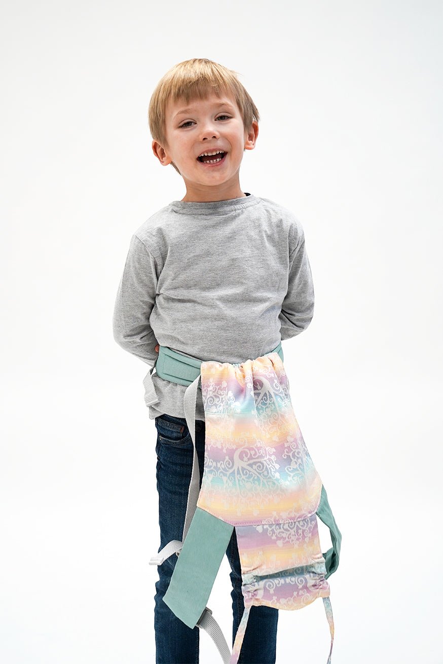 Like all of our babywearing products, the back panel is made from woven babywearing fabric. The waist belt of the MiniFlip is like the Flip the big one adjustable. The bridge width can be easily adjusted on the MiniFlip.
